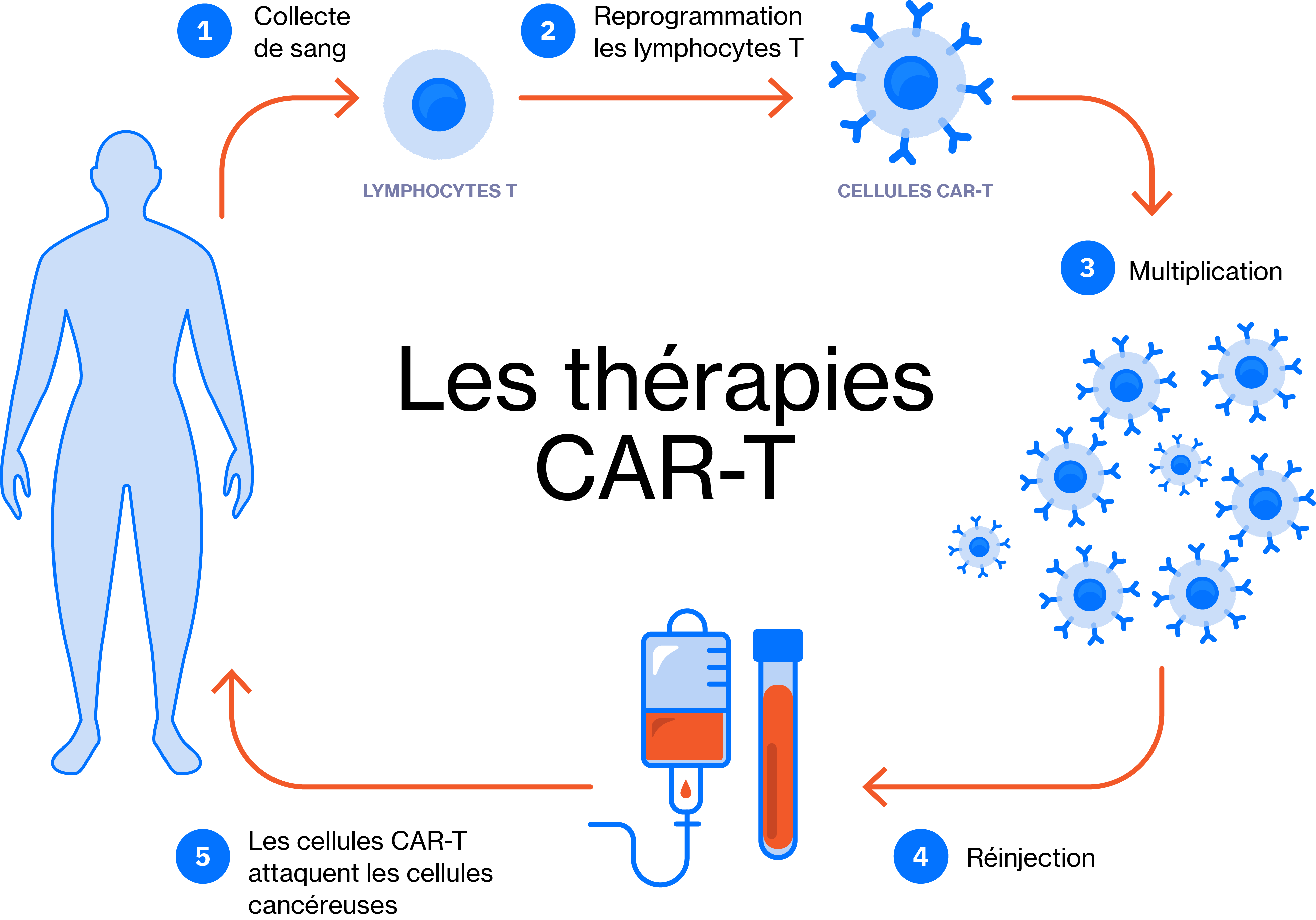Les thérapies CAR-T servant à traiter certains cancers du sang en sont un bon exemple. Ces traitements consistent à prélever les lymphocytes T (cellules immunitaires) d’un patient, à les modifier pour qu’elles ciblent les cellules cancéreuses, puis à les réinjecter dans l’organisme du patient. Il a été démontré que les thérapies CAR-T mènent à un rétablissement plus rapide et à une survie à plus long terme, le tout avec une période de traitement plus courte qu’une chimiothérapie agressive – des résultats qui étaient rares pour ces cancers par le passé 9.